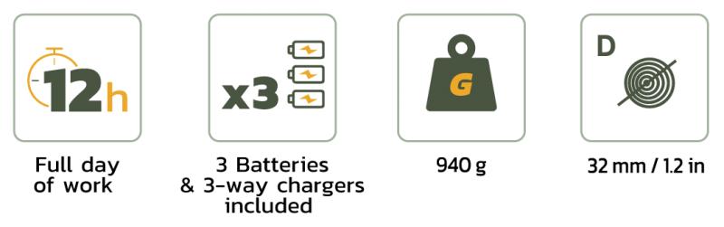 - ТРИ батерии и зарядно устройство, което може да ги зарежда едновременно. Wildhorn 32 ви осигурява непрекъснат работен ден и оптимизирано зареждане