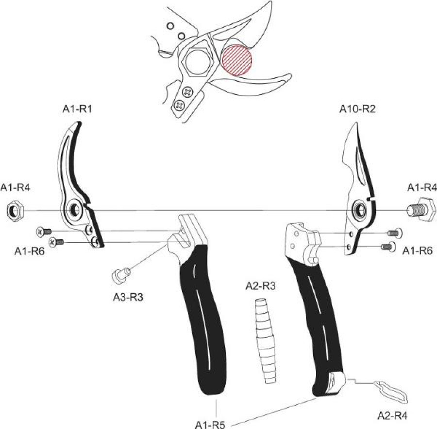 Дръжките са от подсилена алуминиева сплав, осигуряваща лекота и ергономичност и са с покритие против приплъзване. Гумените амортизиращи тампони помагат за намаляване на умората, дори при продължителна употреба. Удобно заключване с прибиране към дръжката по време на работа. Ножиците са напълно разглобяеми и с подменящи се части.