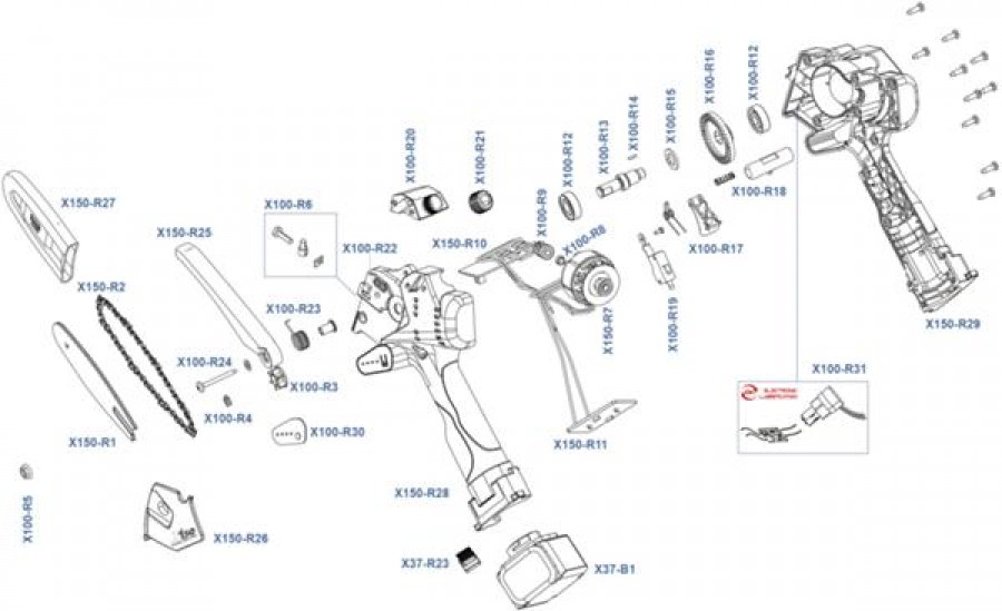 Професионалният акумулаторен верижен трион X150 позволява ефективно подрязване без умора благодарение на перфектния баланс на теглото. Сменяемата батерия се поставя директно върху дръжката и това позволява максимална свобода на движение, увеличавайки продуктивността.